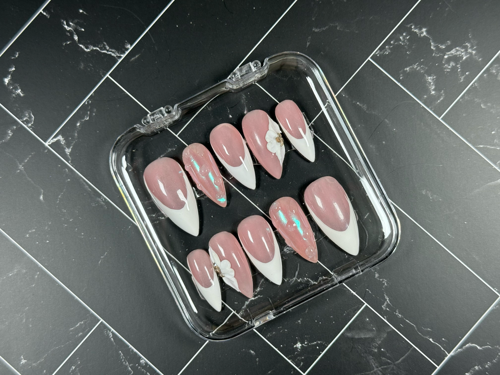 Elegant, soft, and undeniably chic — Give Me Frenchie is your go-to set when you want a timeless look with a modern twist. Featuring a rosy nude base, crisp white French tips, and accent nails adorned with 3D water droplets and delicate floral embellishments, this set adds a subtle luxe vibe to any outfit.