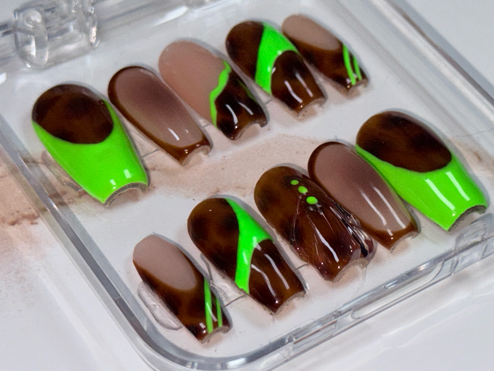 Step into your power with Ultracharged, a high-voltage set that fuses rich mocha tones with vibrant neon green for a striking contrast that demands attention. Featuring bold swirls, split-color blocking, minimalist striping, and layered 3D accents, this set gives electric energy with a sleek, futuristic edge.